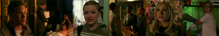 Sheriff's office – corridor: Veronica asks why they think he did it. He explains that people saw him leaving with her and that he was the last guy she remembered seeing. His hair and fibres were all over her room, and the clothes he was wearing the night before had just been washed. Veronica asks if it is any wonder they suspect him, and Troy protests that they were having ‘PG-13' fun, when she got sick. He helped her into bed and went to the laundrette to clean his clothes, as he didn't have any others with him. Veronica agrees to help him, but if she decides he did it, she will help them nail him to the wall. Troy says he got trouble from a guy who was hitting on her earlier in the evening, and mentions he was wearing a Pi sweatshirt.