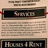 Partner to Kevin and magic disappearer of debts. Hey, did Patrice Pitrelli manage to become sane, change her name slightly, and get a new job? Okay, that's probably not it. But we can't help but notice her ad is right below the rapist's — a clue of some sort? Perhaps Kevin and Patricia know more than they let on. Perhaps Kevin was the guard to Patricia's prisoner in the prison experiment and they know the secret of Mercer and Moe? Okay, maybe not. It still doesn't stop us from speculating in 3.09 "Spit & Eggs."