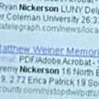 Name appearing on a Google search for Patrick Nickerson. She could be a cousin of Danica Patrick, as they both race. Erica chooses to run her races on foot, however, running the Matthew Weiner Memorial 5K Road Race alongside her boyfriend, Jeremy Nickerson. The race commemorates a Princeton freshman who died during a pickup basketball game in 1999. We don't know how far a girl from South Bend, PA has to run to join the race in New Jersey, but it's awfully nice of her. We get a glimpse into her charitable spirit in 3.19 "Weevils Wobble But They Don't Go Down."