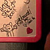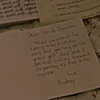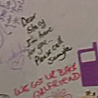 Student at Hearst College with horrible handwriting. "Cuebourd"? "Curboard"? Oh, "Cute board"! Anyway, she wants Parker to call her in 3.04 "Charlie Don't Surf."
