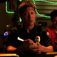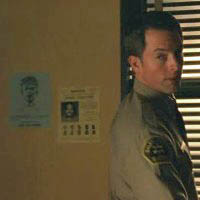 He's never seen surfing or in possession of a surf board, but his hair and speech fit the part. He asks Sheriff Lamb if his jurisdiction extends all the way to Mexico in 2.11 "Donut Run."